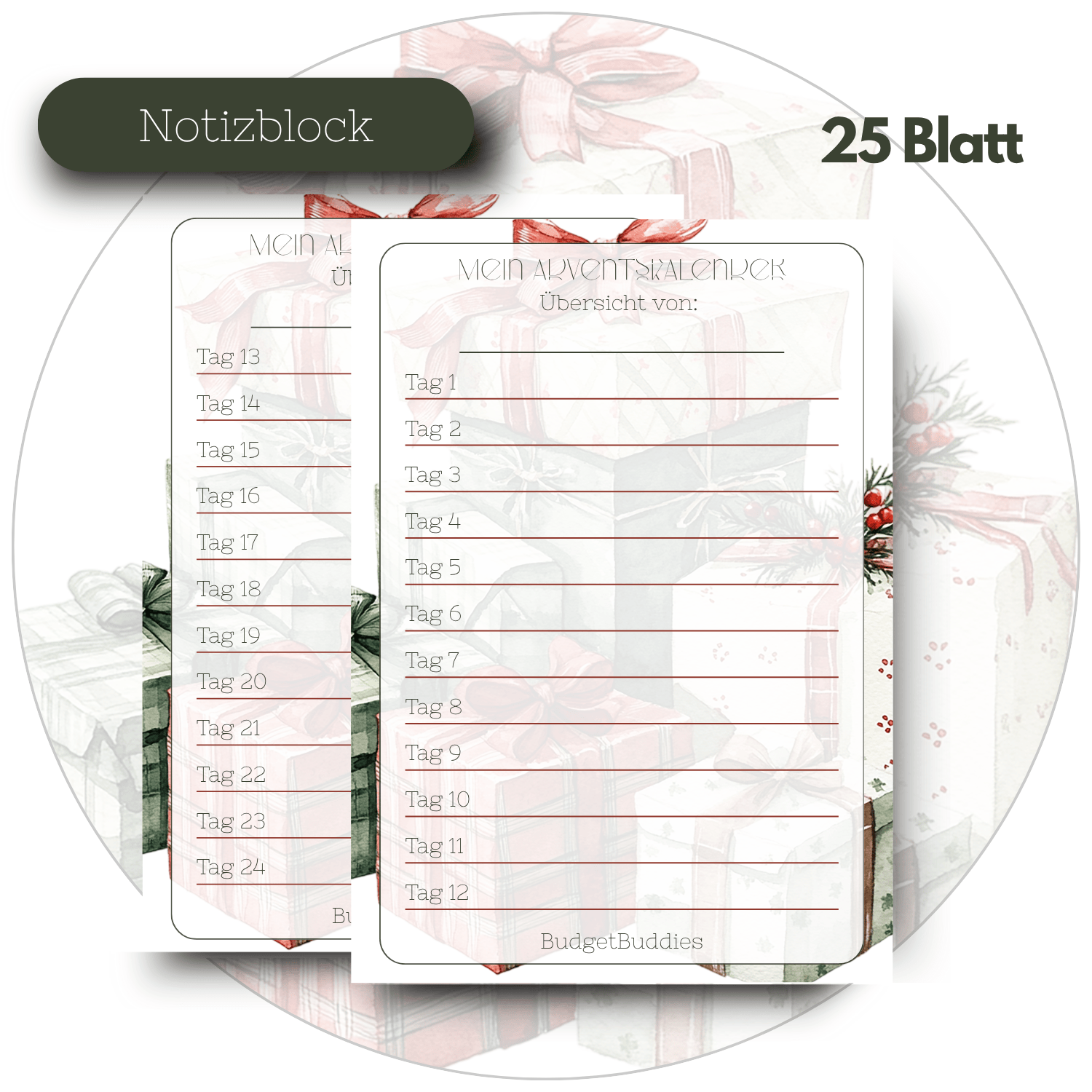 Dieser Block kann für deine Übersicht zu deinen Adventskalendern helfen. Ich persönlich möchte auch in einem halben Jahr wissen, was in meinem Kalender eigentlich drinnen war. Hat er sich gelohnt oder war es doch eher flopp? Dazu ist dieser Block. Er ist doppelseitig bedruckt und von Tag 1 bis Tag 24 ausfüllbar.