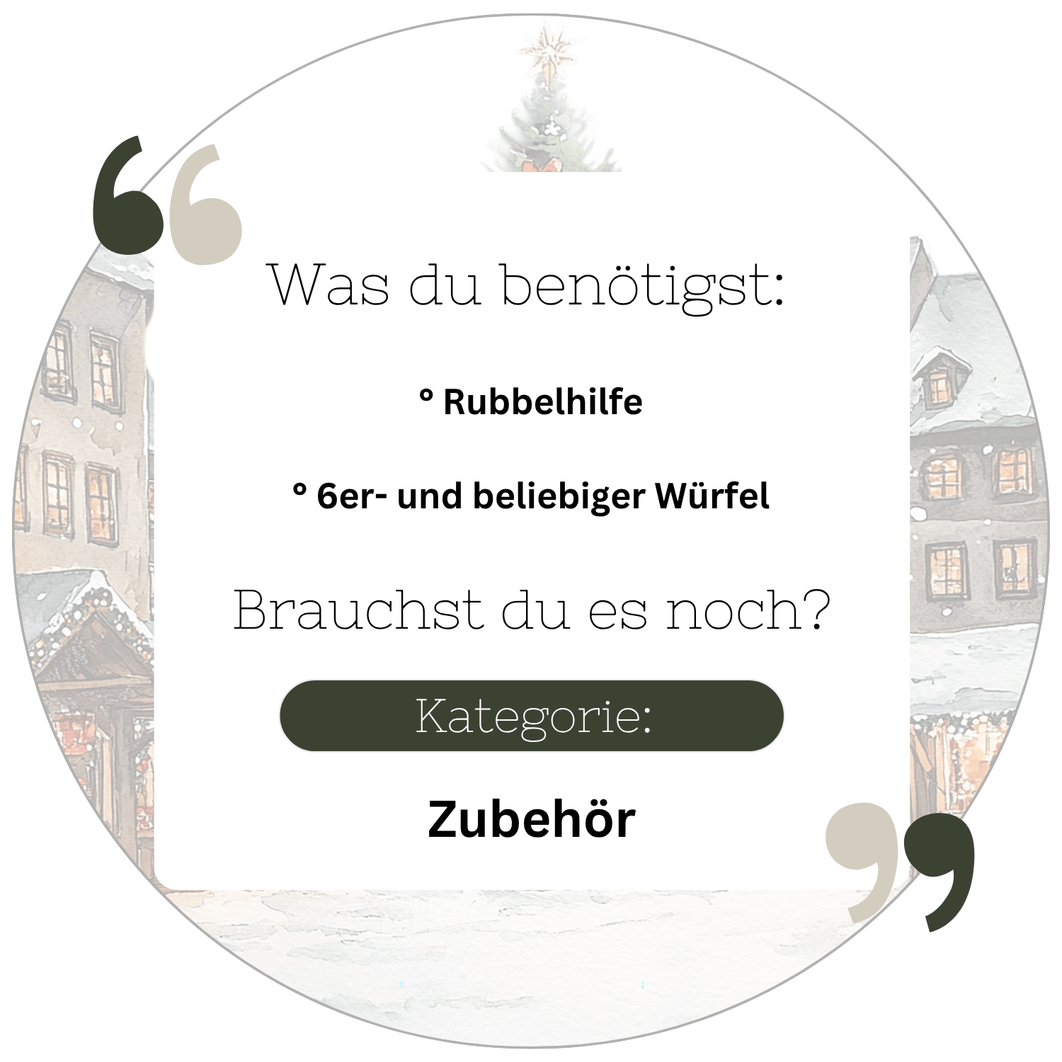 Du kannst dich auf dieser Challenge frei austoben. Es gibt hier keine Vorgaben in welcher Reihenfolge du alles erledigen musst. Du kannst Würfeln, Rubbeln und Abstreichen. Sollte dir ein Betrag zu hoch: Spare die Quersumme (12= 1+2). Spare für deine nächsten Besuch auf dem Weihnachtsmarkt.
